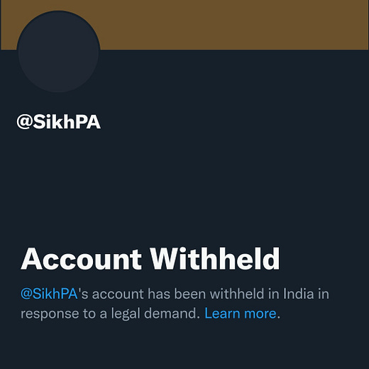 As of today multiple Sikh accounts like @sikhpa, @everything13, @tractor2twitter, and others have experienced restrictions in India. I am not hopeful that the Indian system, which sleeps on the files of Sikh prisoners and victims of genocide, has the fortitude to look Delhi in the eyes and ask questions.