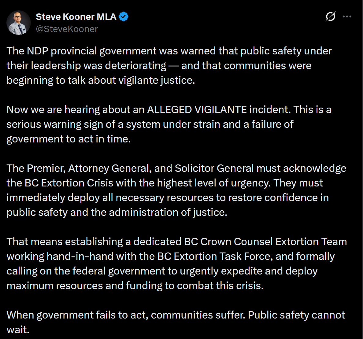 Steve Kooner offers a slightly different performance, but the same avoidance. He states: “BREAKING: Realtors fear becoming extortion targets for their success in BC.” He says a brokerage postponed an awards gala because realtors feared being targeted, then declares: “I’ve been sounding the alarm for months: this extortion crisis is not just a public safety failure, it’s an economic threat.” He warns that “jobs, investment, and livelihoods are at risk,” then asks the predictable question: “Why has the NDP government failed to support victims and their businesses?”