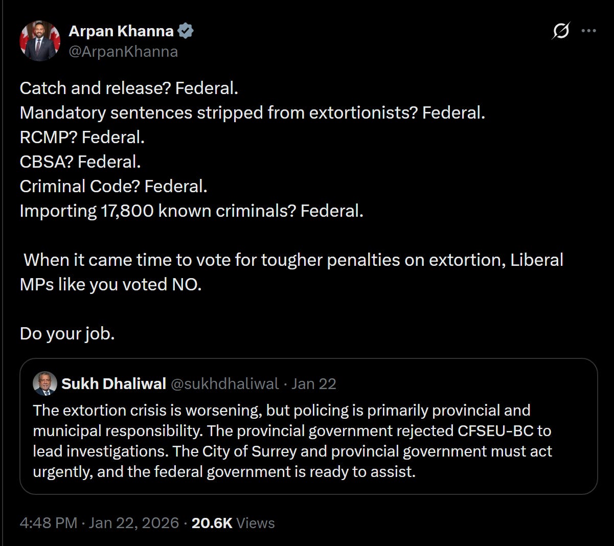 Arpan Khanna compresses the entire script into a blunt checklist meant for applause. “Catch and release? Federal. Mandatory sentences stripped from extortionists? Federal. RCMP? Federal. CBSA? Federal. Criminal Code? Federal. Importing 17,800 known criminals? Federal.” Then he concludes, “Do your job.” In Parliament, he repeats the same rhythm, framing the issue as the result of “soft on crime policies,” claiming extortions have “more than tripled,” and asking why the Liberals voted against a Conservative bill “to fight extortion.”