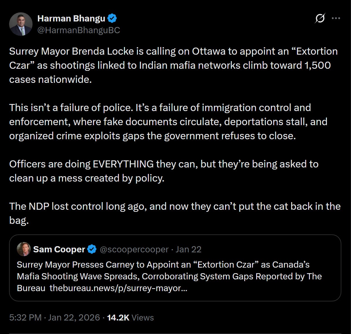 “Surrey Mayor Brenda Locke is calling on Ottawa to appoint an ‘Extortion Czar’ as shootings linked to Indian mafia networks climb toward 1,500 cases nationwide.” The phrase “Indian mafia networks” is placed on the table, and then immediately abandoned.