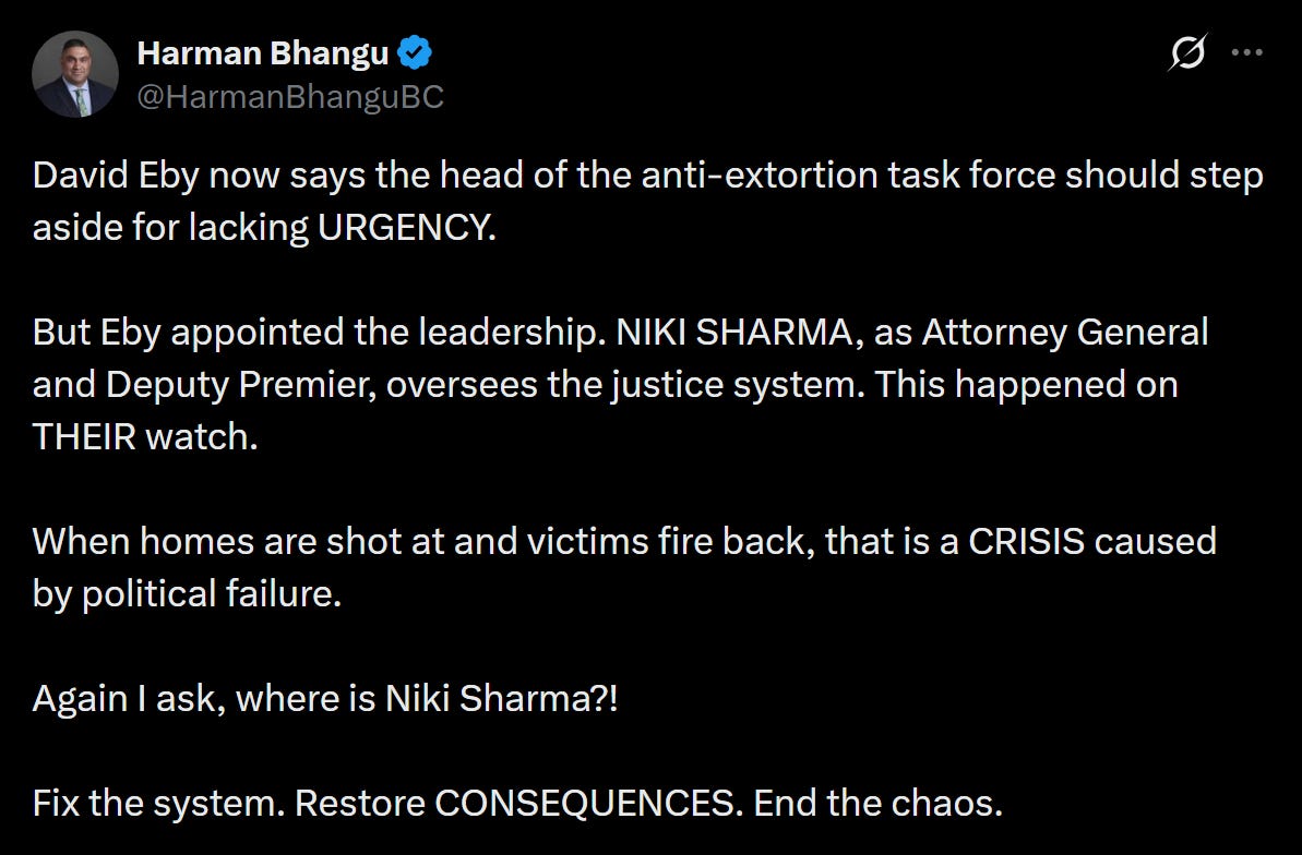 Bhangu repeats the same posture in another statement. He writes: “David Eby now says the head of the anti extortion task force should step aside for lacking URGENCY.” Then he turns it into an internal blame ritual: “But Eby appointed the leadership. NIKI SHARMA, as Attorney General and Deputy Premier, oversees the justice system. This happened on THEIR watch.” He escalates the drama: “When homes are shot at and victims fire back, that is a CRISIS caused by political failure.” And then the slogan that pretends to be strategy: “Fix the system. Restore CONSEQUENCES. End the chaos.”