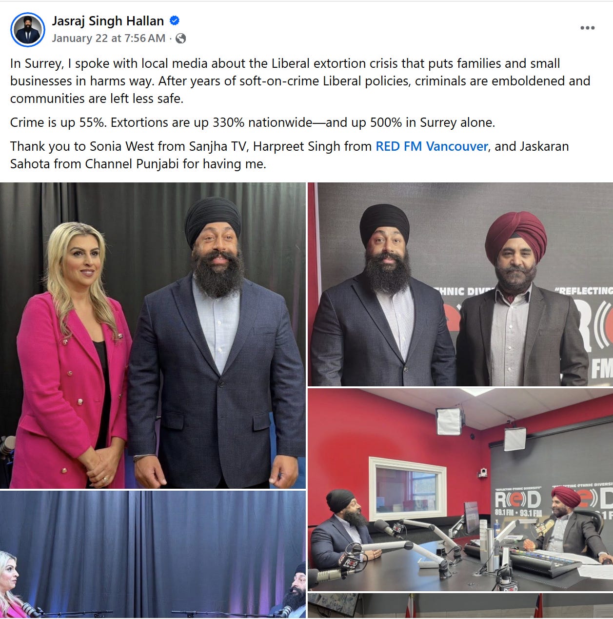 “In Surrey, I spoke with local media about the Liberal extortion crisis that puts families and small businesses in harms way. After years of soft on crime Liberal policies, criminals are emboldened and communities are left less safe. Crime is up 55%. Extortions are up 330% nationwide and up 500% in Surrey alone.”
