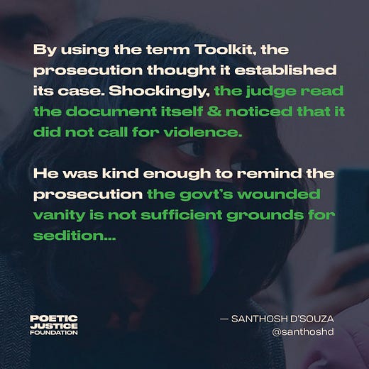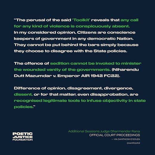 "The perusal of the said 'Toolkit' reveals that any call for any kind of violence is conspicuously absent. In my considered opinion, Citizens are conscience keepers of government in any democratic Nation. They cannot be put behind the bars simply because they choose to disagree with the State policies."