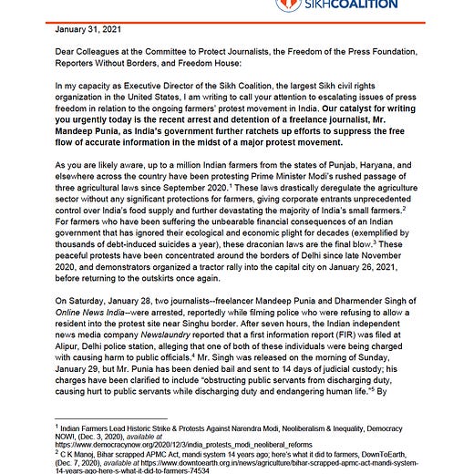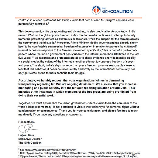 He specifically asks the White House to issue a statement that “does not condone the anti-democratic response of India’s government against peaceful protests…. Just as a statement was recently issued in connection with Russia.”