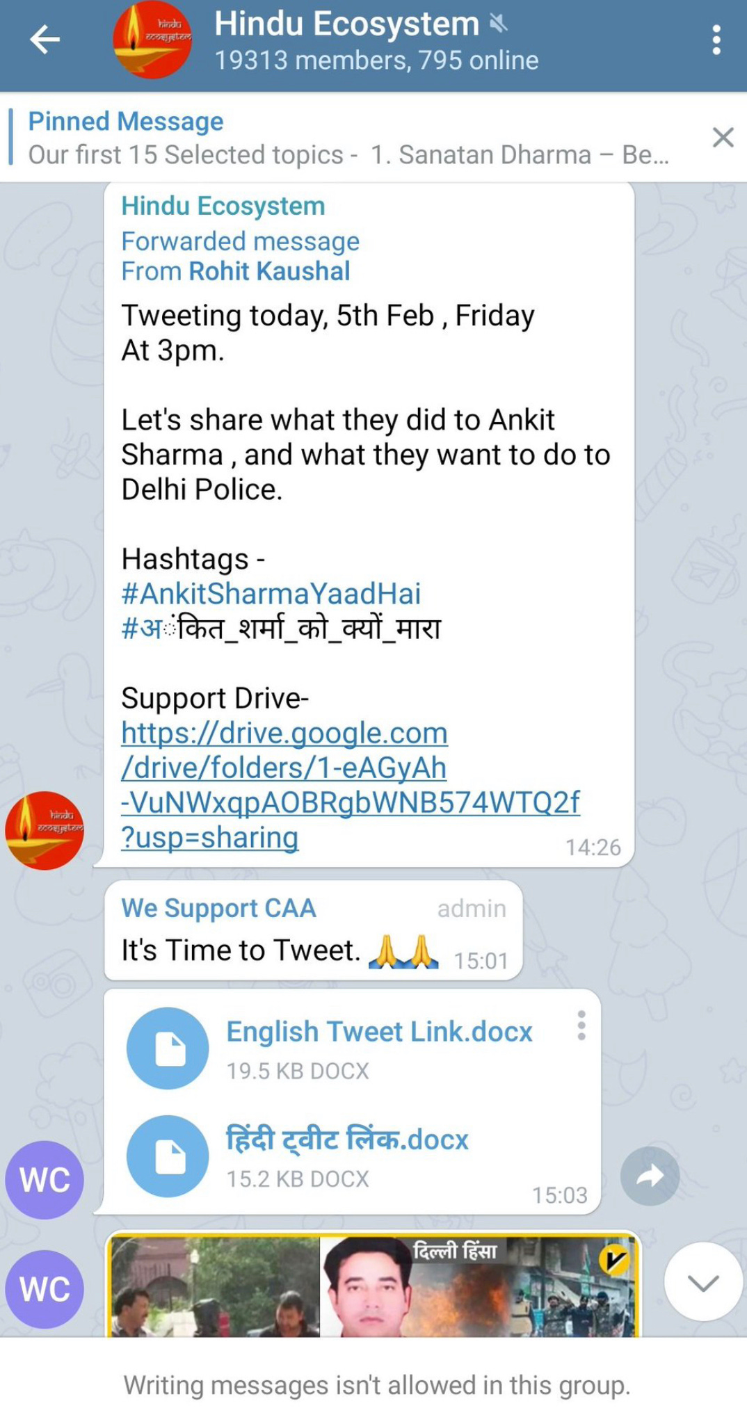 Yuvraj also further shared details of a “Hindu Ecosystem chat and several other Telegram & WhatsApp groups” that are used to internally communicate amongst cell members and share toolkits. I came across several screenshots of the chat, which shared links to Google Docs.