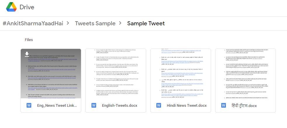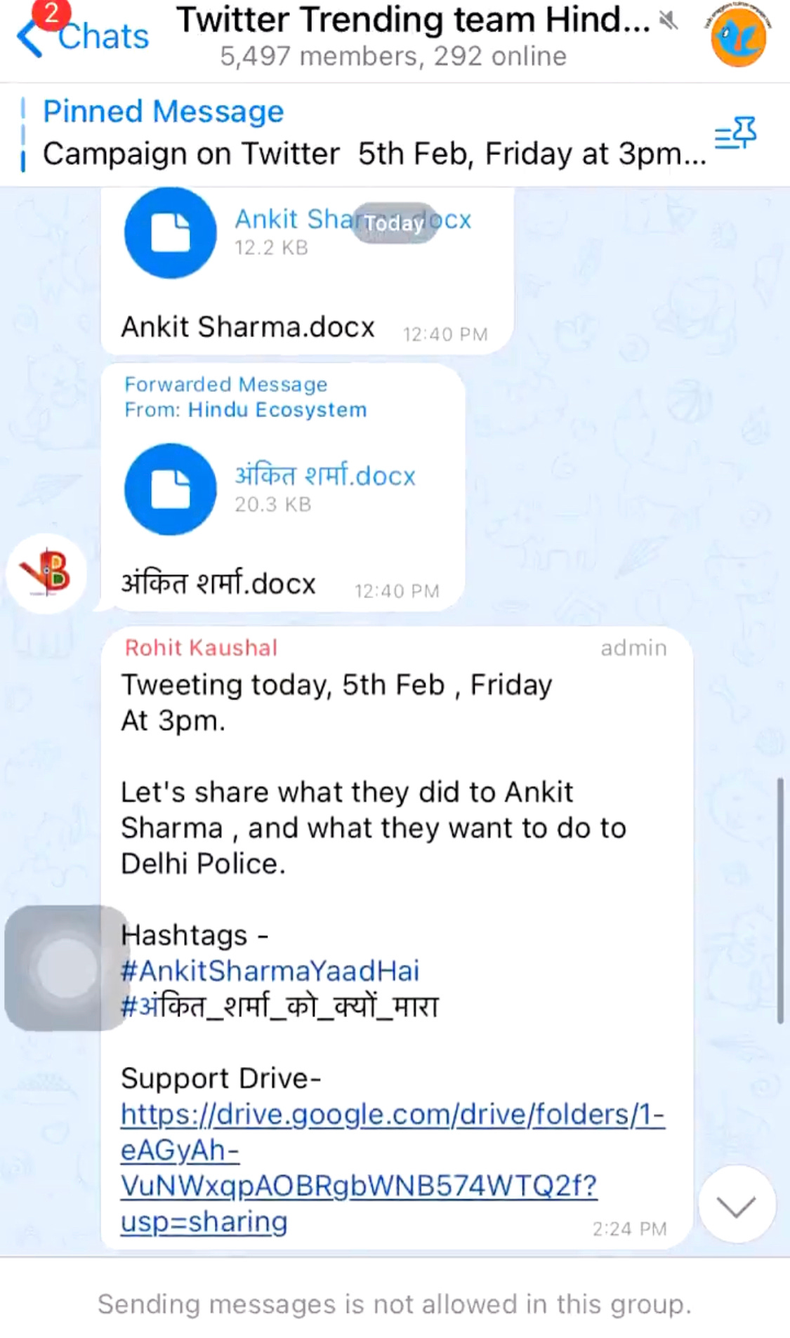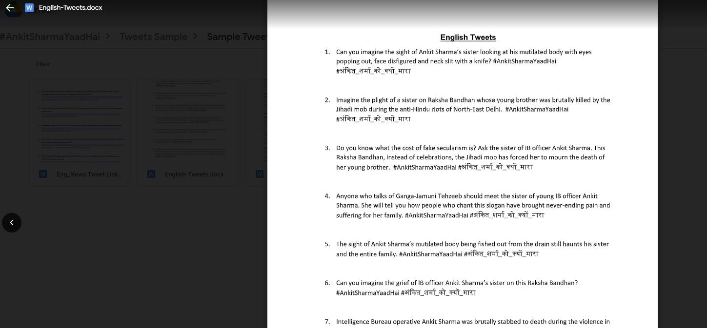 The hashtag being promoted in the toolkit document is #AnkitSharmaYaadHai, with pro-Modi and pro-BJP messaging. The contents of the toolkit folder include documents of tweets in English and Hindi. These were then spammed on Twitter by the IT Cell.