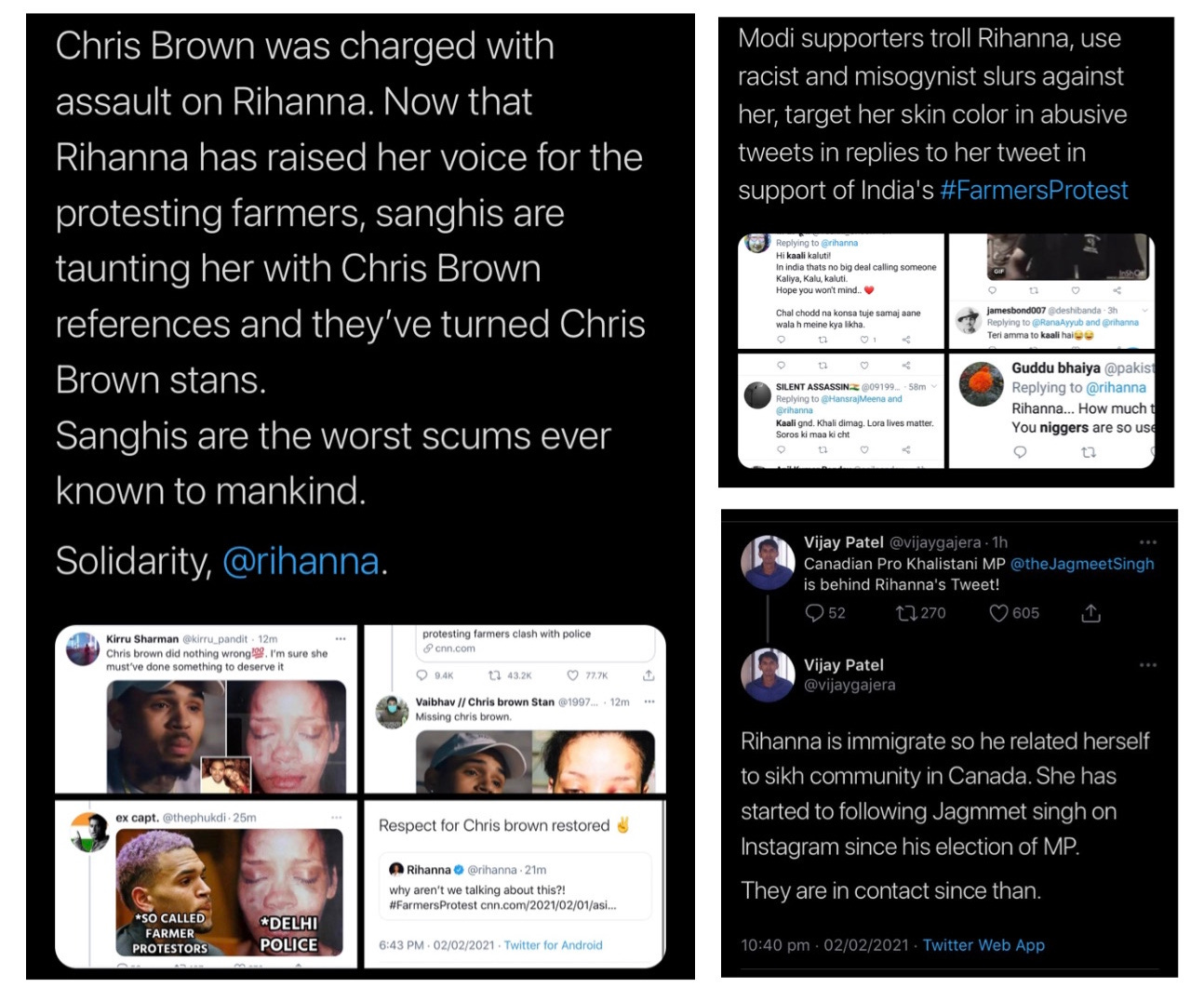 Upon voicing their solidarity with the farmers’ protest, international figures like Rihanna, Amanda Cerny, Greta Thunberg, Mia Kalifa, Meena Harris, and others have all been at the receiving end of similar false allegations, violent threats, misogynist and sexist rhetoric, and some have even been labeled terrorists by BJP IT Cell employees.