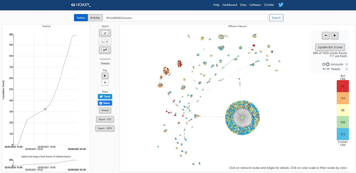 To verify whether this was the case for the farmers’ protest, I used Hoaxy - a data visualization tool that identifies trends and commonalities between accounts. It uses a ‘bot score’ system to assess the level of automation of an account with five being the highest and zero being little to none.